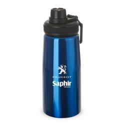 Squeeze metálico 750ml com alça para transporte, possui tampa com detalhe emborrachado e tampa protetora para o bocal.