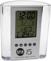 Porta Lápis em Acrílico com Relógio, Dispertador, Data e Marcador de Temperatura