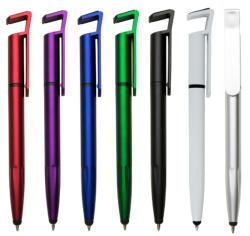 Caneta pl�stica touch com suporte para celular, colorida com detalhes preto. Clip pl�stico aberto utilizado para suporte e parte superior com limpador de tela, possui anel preto abaixo do clip e parte inferior com detalhes em relevo. Acionada por giro.